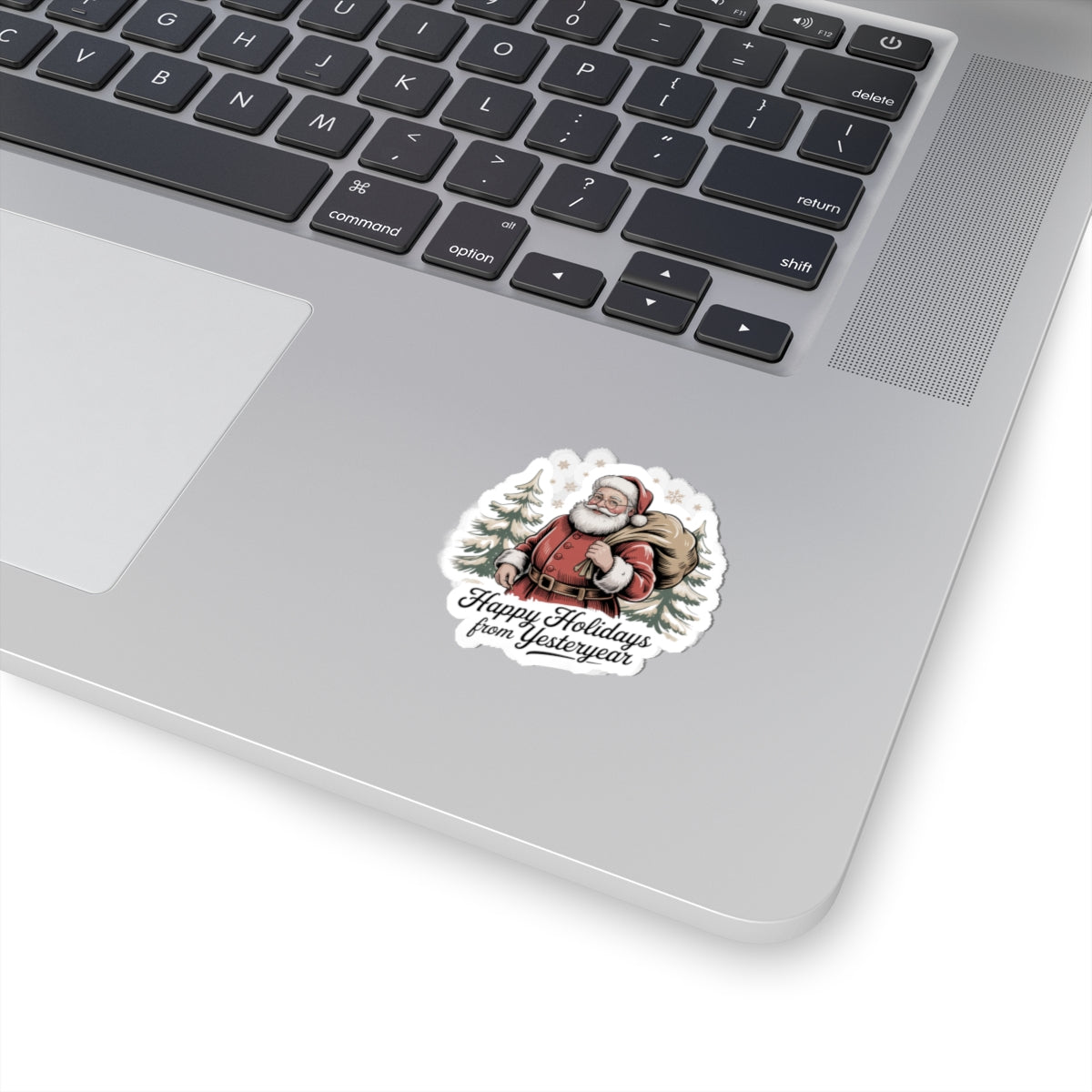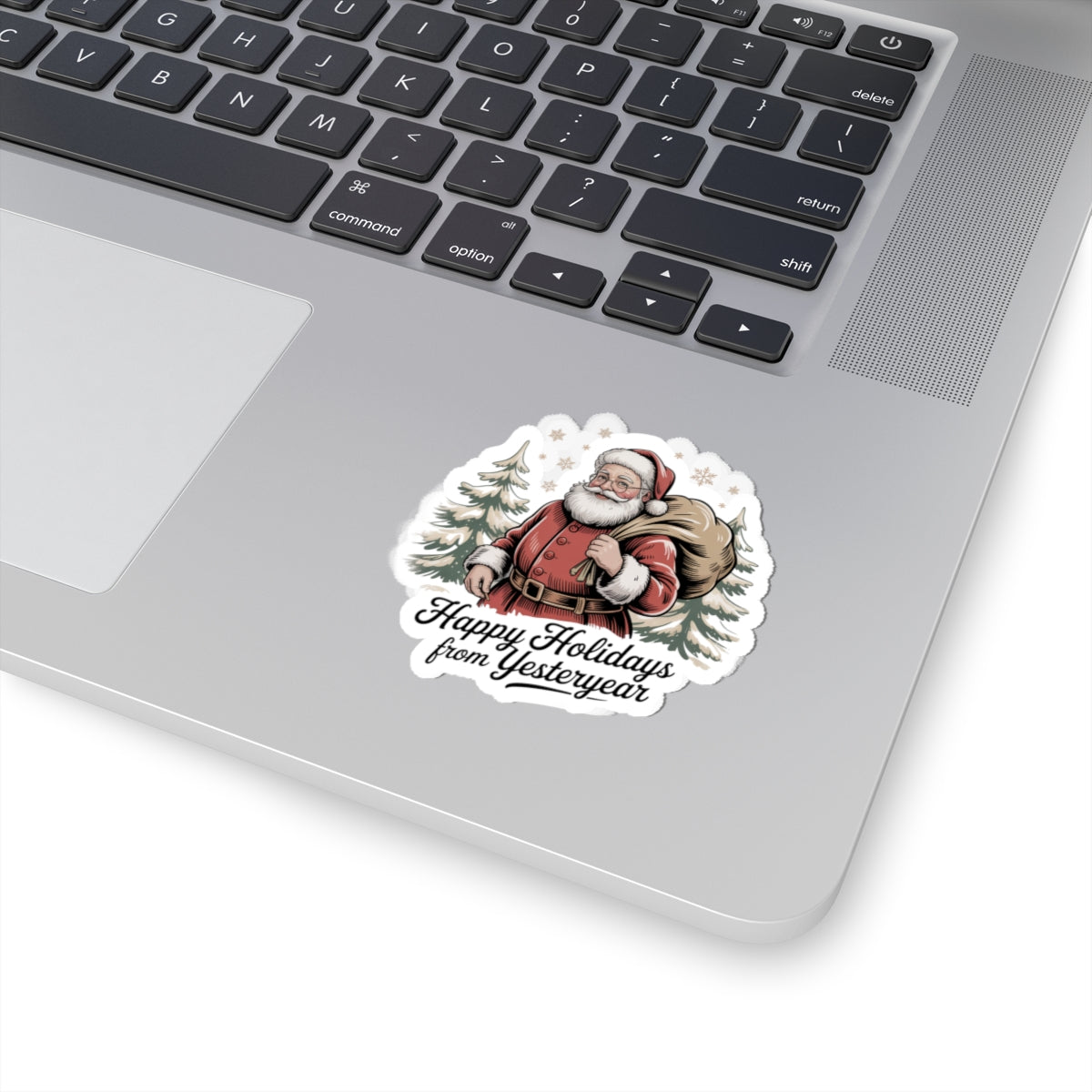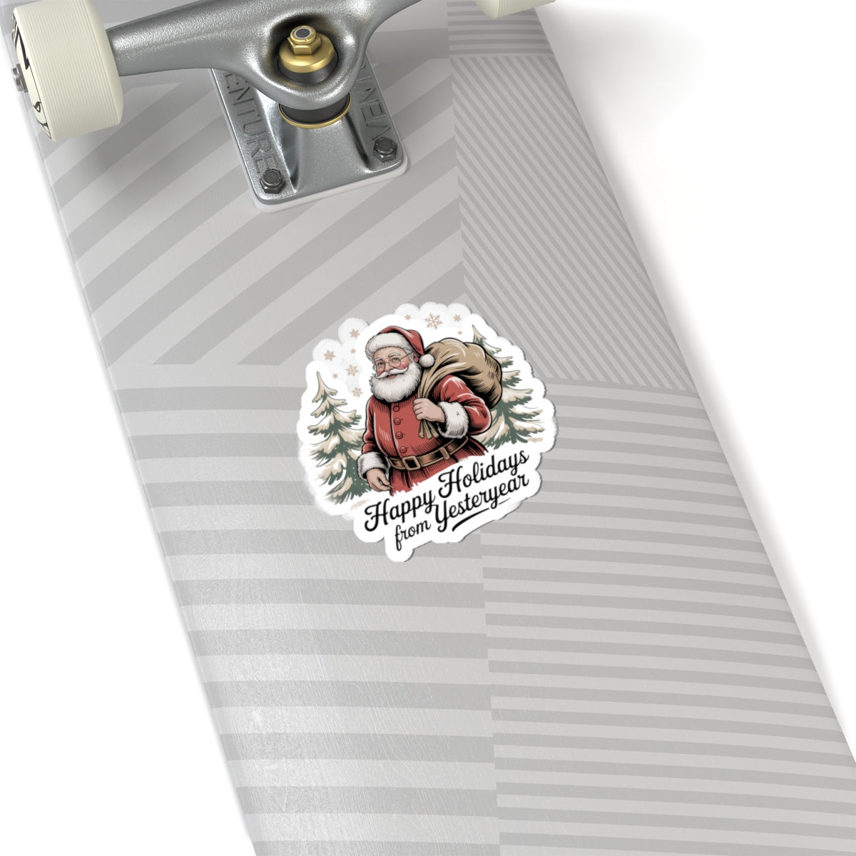 A kiss-cut vinyl sticker that channels vintage postcard Christmas charm — a softly muted, illustrated Santa with a overflowing sack framed by pine trees and a warm script caption. The design uses grainy texture and period-inspired lettering to evoke 1920s–50s holiday correspondence, fitting a nostalgic, old-fashioned xmas aesthetic for collectors and seasonal decor. Its compact, image-first layout makes it easy to place on laptops, journals, or windows to add a faded, cozy holiday accent.