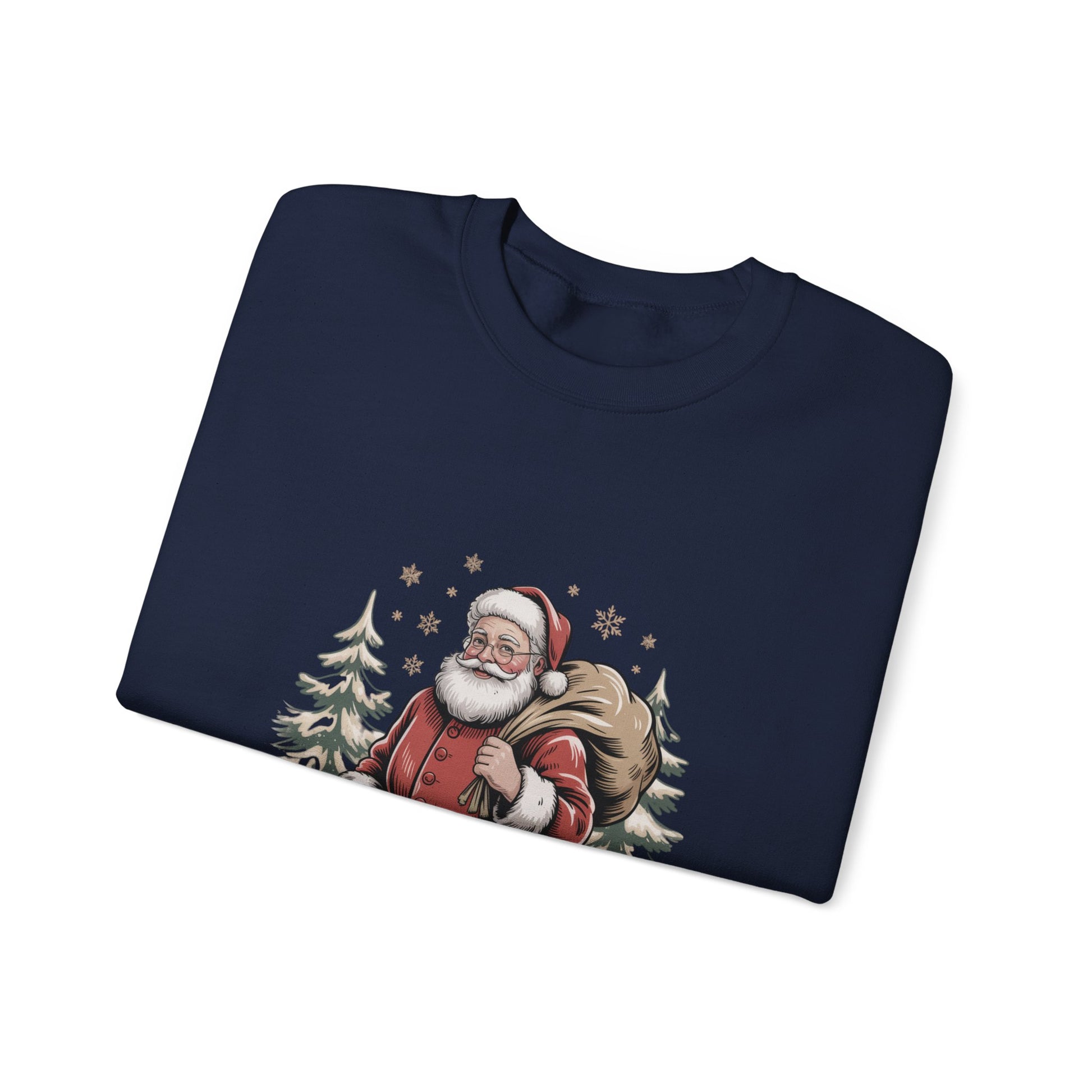 Retro-inspired crewneck sweatshirt featuring a muted, postcard-style Santa vignette framed by pine silhouettes and retro script—evokes the faded, sentimental look of 1920s–50s holiday postcards. The artwork uses soft, worn tones and a subtle grain to read like an old-fashioned holiday greeting, sized for a centered chest print or optional small left-chest embroidery. Suits shoppers seeking vintage Christmas postcard or retro holiday card design apparel that layers easily for cozy, seasonal wear.