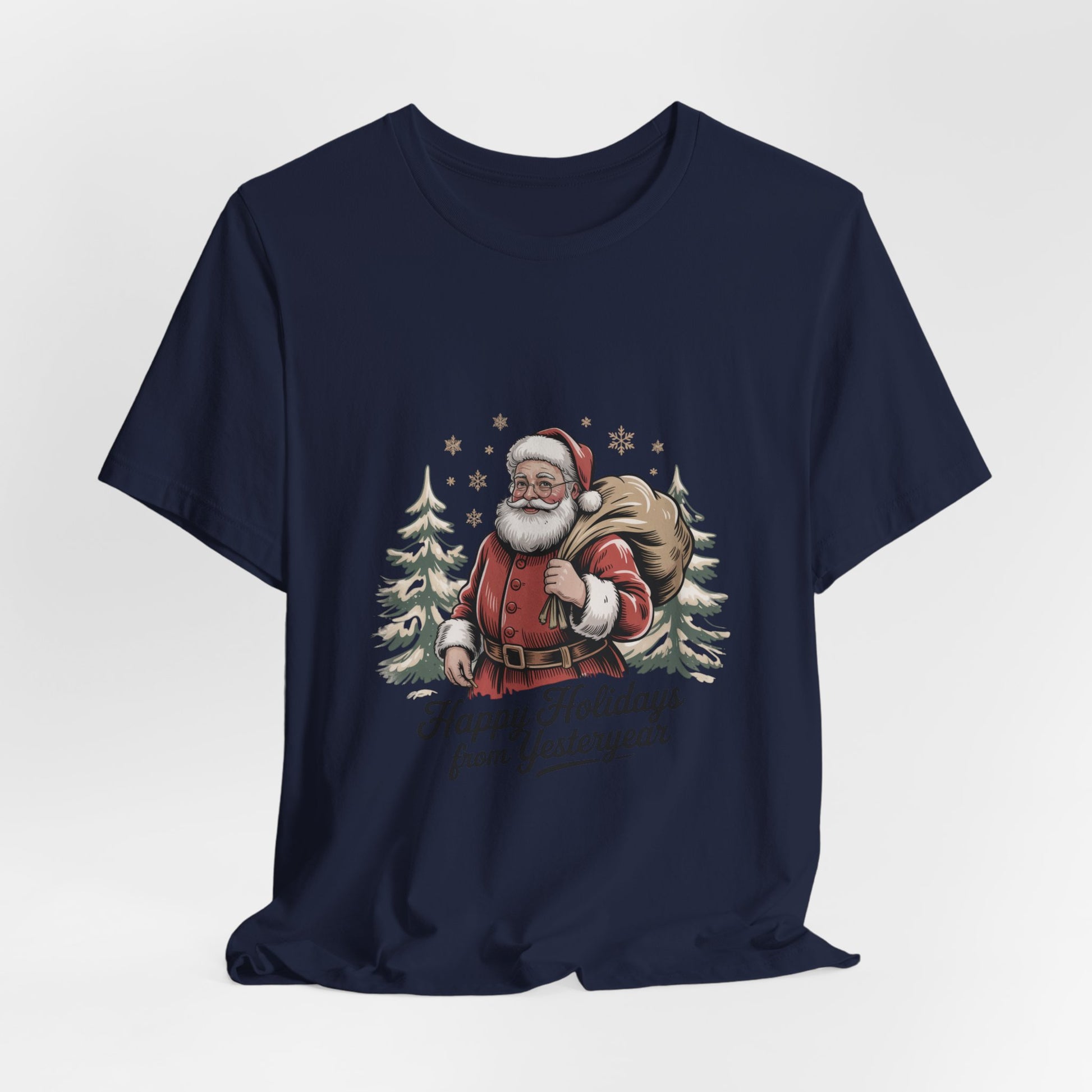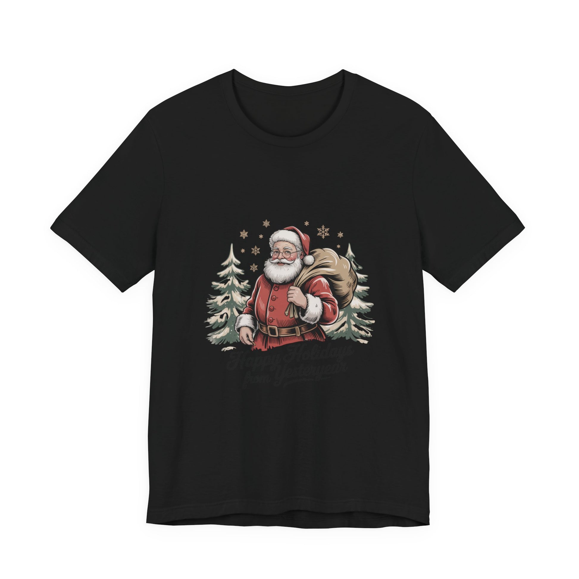 Vintage postcard–style Santa printed on a soft unisex tee, evoking muted, sepia-tinged holiday cards from the 1920s–50s. The artwork shows a classic Santa with a sack and fir trees, finished with grainy texture and retro script reading a short seasonal greeting. Subtle fading and warm tones give the shirt a nostalgic, collectible feel that fits the vintage Christmas postcard trend.