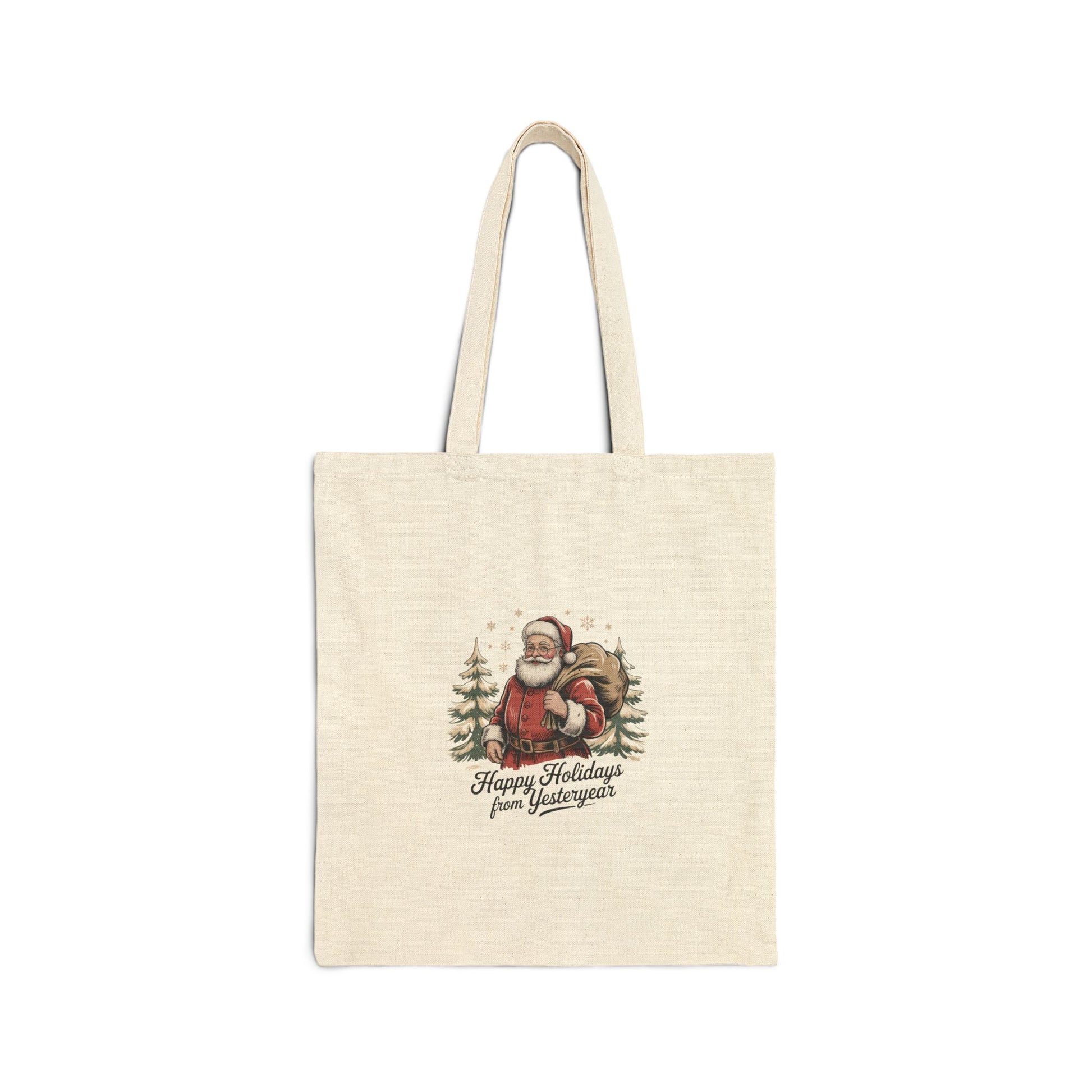 A natural cotton tote printed with a faded, postcard-style holiday scene—Santa in muted reds and evergreen hues framed by pine trees and vintage script. The artwork channels old-fashioned Christmas postcards with soft grain and period serif lettering, offering a quiet, collectible seasonal look that pairs with nostalgic wardrobes and holiday decor. Fits the “vintage postcard Christmas” aesthetic for shoppers seeking retro holiday card imagery on everyday accessories.