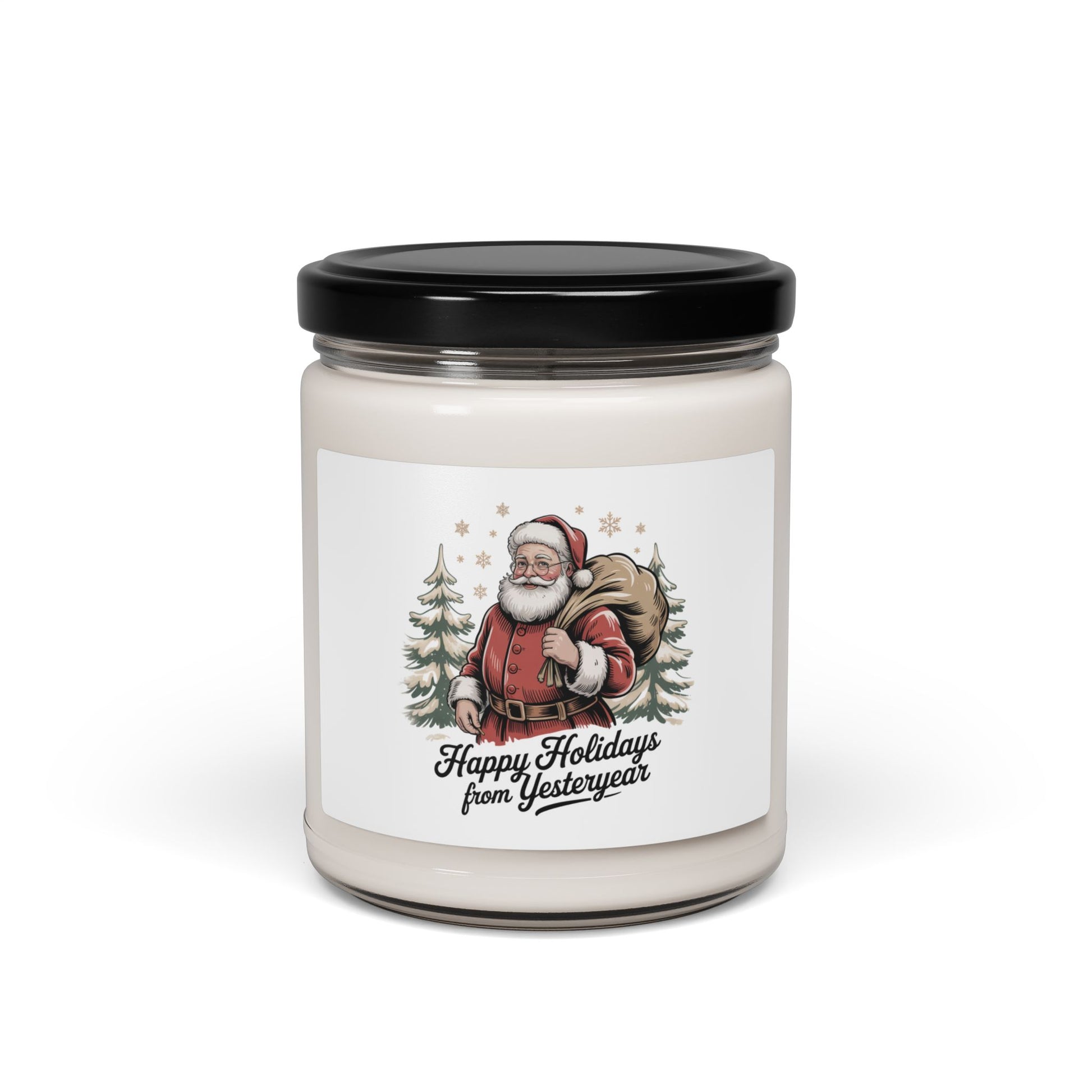 Vintage postcard–style holiday candle that channels faded, sepia-toned greetings from midcentury Christmas cards. The label features an old-fashioned Santa illustration, muted greens and warm reds with period script that reads like a short seasonal caption. Choose a classic scent such as Cinnamon Vanilla, Christmas Warmth, or Unscented to complete a cozy, nostalgic mantel or seasonal display for collectors and traditionalists who seek an analog, retro holiday mood.